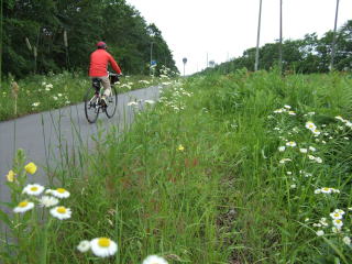 支笏湖から苫小牧に向かっては、道路と送電線が自転車道路の傍を通っているので、森の中でも開けた原生花園のなかを走る事になります。