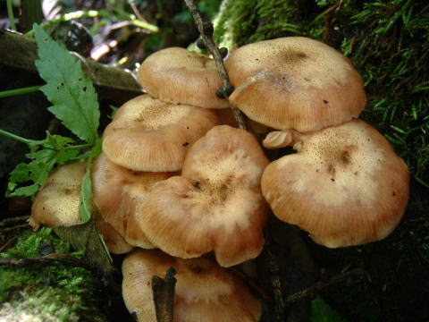 地面の倒木に生えたナラタケです。倒木の周りの地面から直接生えてるのもあり、これらも同じナラタケです。