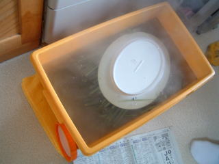A 容器の中でワラビが隠れるほどの量の熱湯を入れて一晩放置します。その時、お湯からワラビ