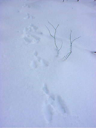 新雪が降った翌朝、森の中を歩いていると、キツネやウサギ、エゾリスなどの足跡を見つけることが出来ます。ウサギの足跡に天敵のキツネの足跡が交差していたり、平行に歩いた跡があったりするので、時間差とはいえ、とっても不思議な気持ちになります。また、いままで見たことも無い、自分の知らない形の足跡があると、いろいろ想像力を働かせて考えるのですが結局解りません。