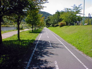 左の写真は、西区・平和の滝へ向かう自転車道路です。住宅街のそばを通り、公園のようです。